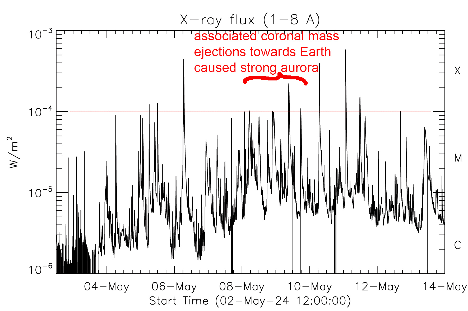 Sonneneruptionen werden nach ihrer Intensität in A, B, C, M (mittelstark) und X (extrem) eingeteilt.